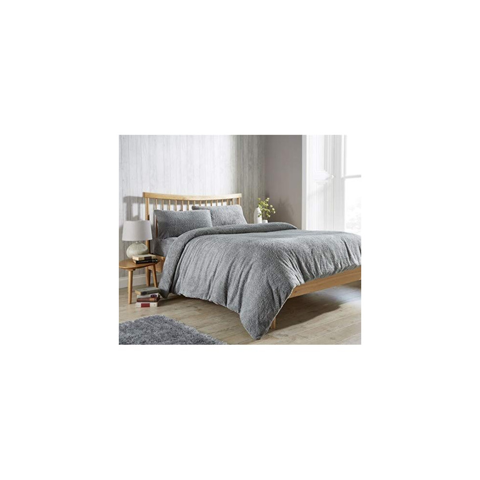 Brentfords Reversible Teddy Fleece Duvet Cover with Pillow Case Supersoft Fluffy Thermal Warm Soft Bear Bedding Set, Charcoal Silver Grey - King