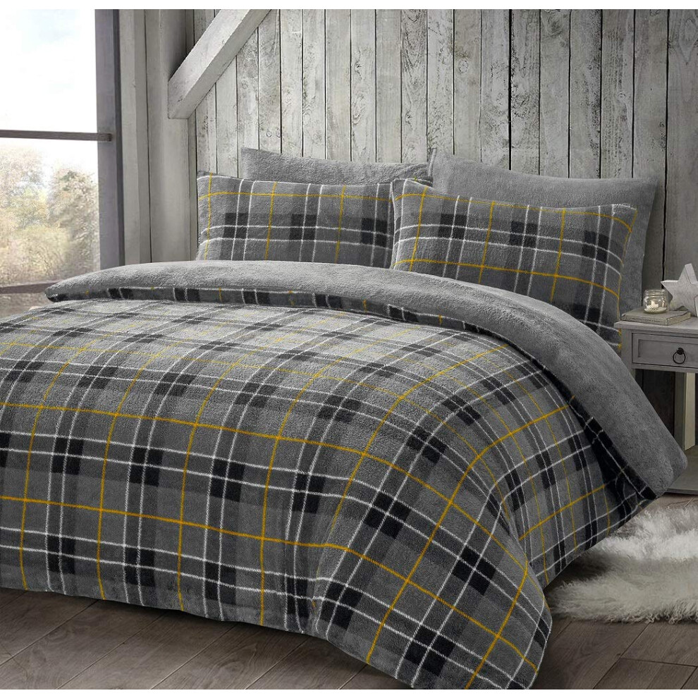 HOMES-LINEN Teddy Bear Fleece Tartan Check Duvet Cover Soft Cosy Warm Checked Teddy Bear Bedding Set (Grey, King)