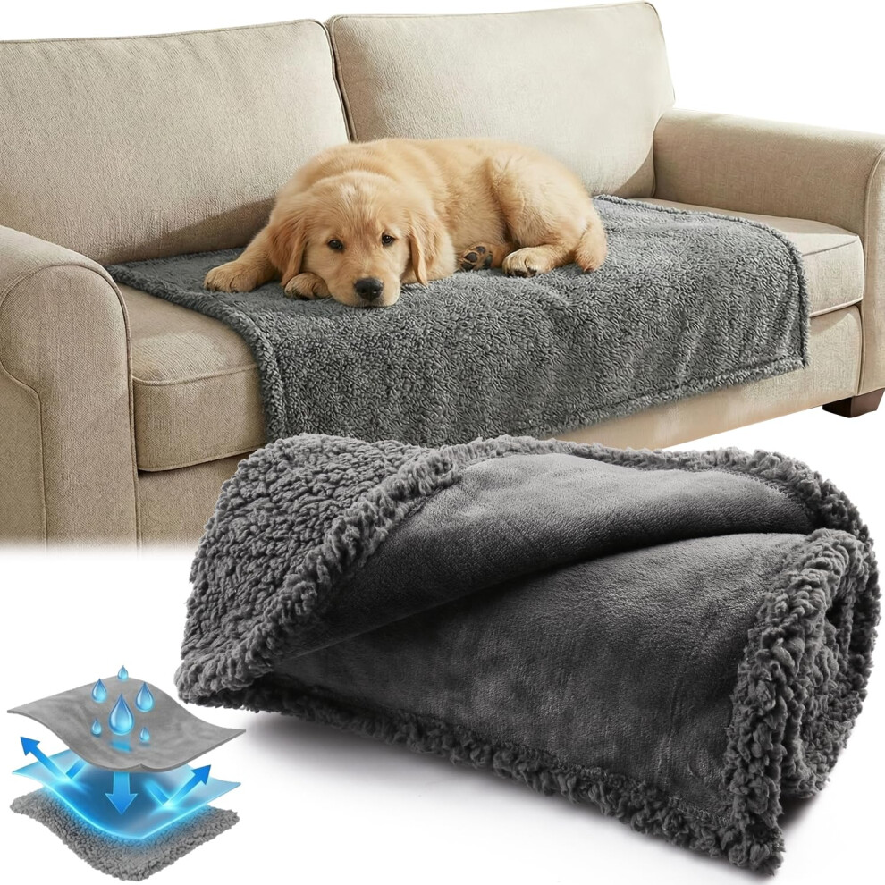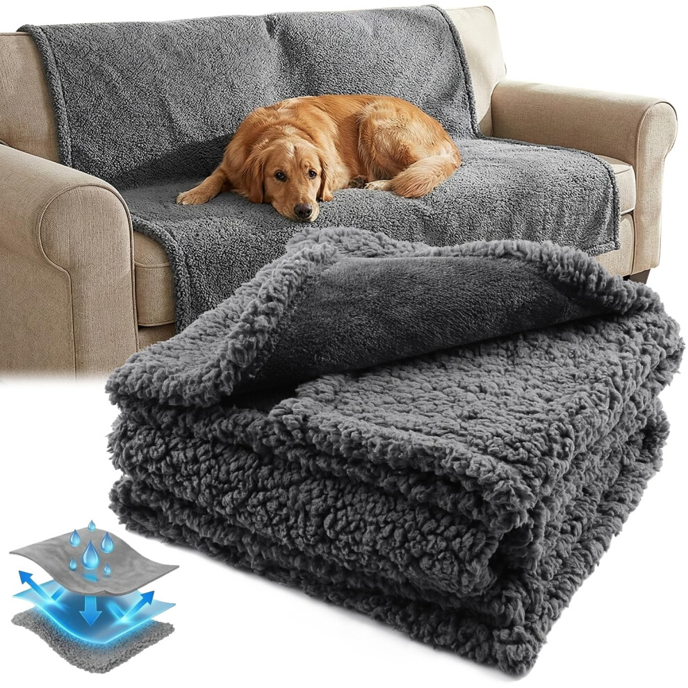 Onarway Waterproof Dog Blanket X-Large: 145cm x 165cm Grey Pet Throw for Bed Sofa & Car - Washable Sherpa Fleece Cover - Leakproof Dog Furniture