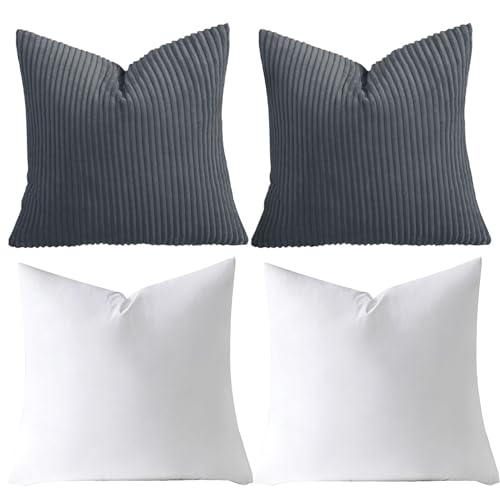 AMEHA Corduroy Grey Velvet Cushions with covers included Pack of 2 (2 Covers 45 x 45 cm, 2 Inserts) Square throw Pillowcases with Invisible Zipper for Sofa Bed Livingroom 18”x18” inches