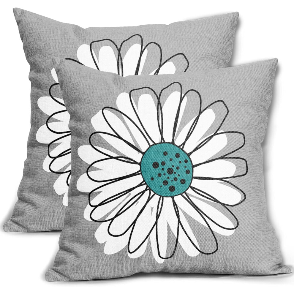 Teal & White Daisy Pillow Covers 18x18, Set of 2, Spring/Summer Gray Linen Throw Pillows for Sofa, Bed, Outdoor â Compatible with Standard Inserts