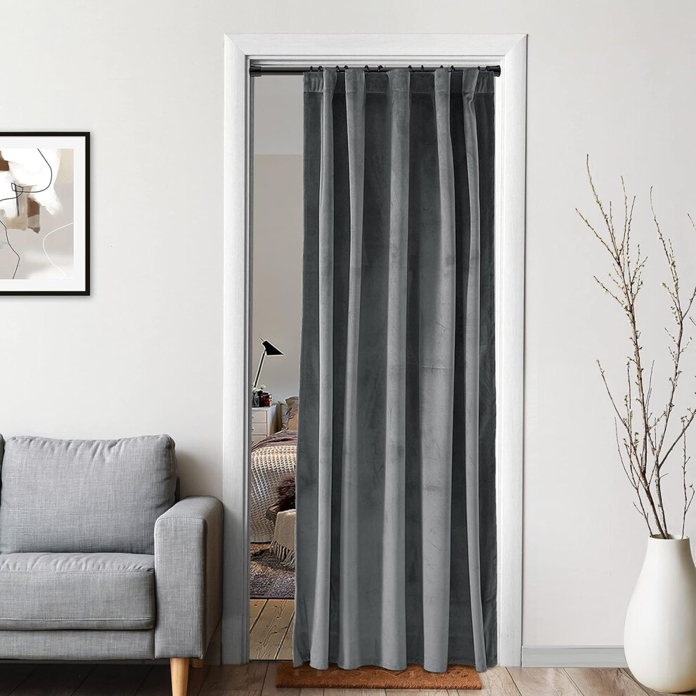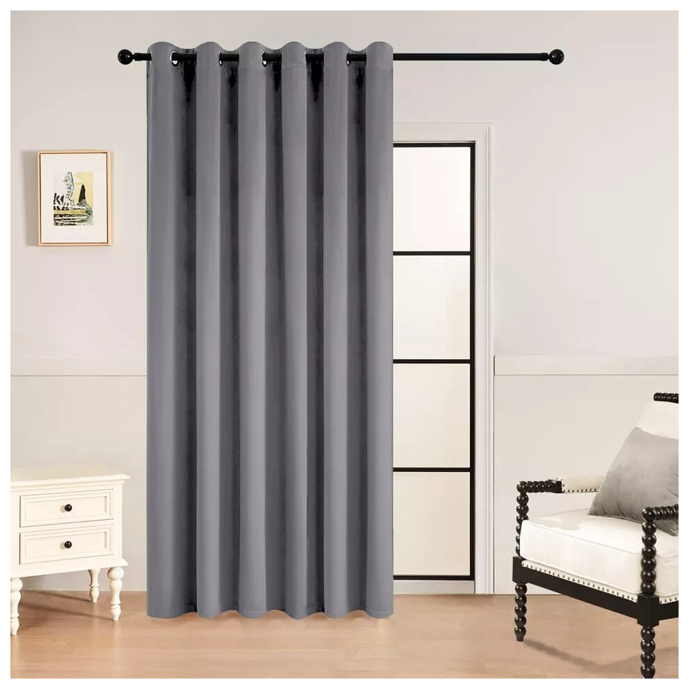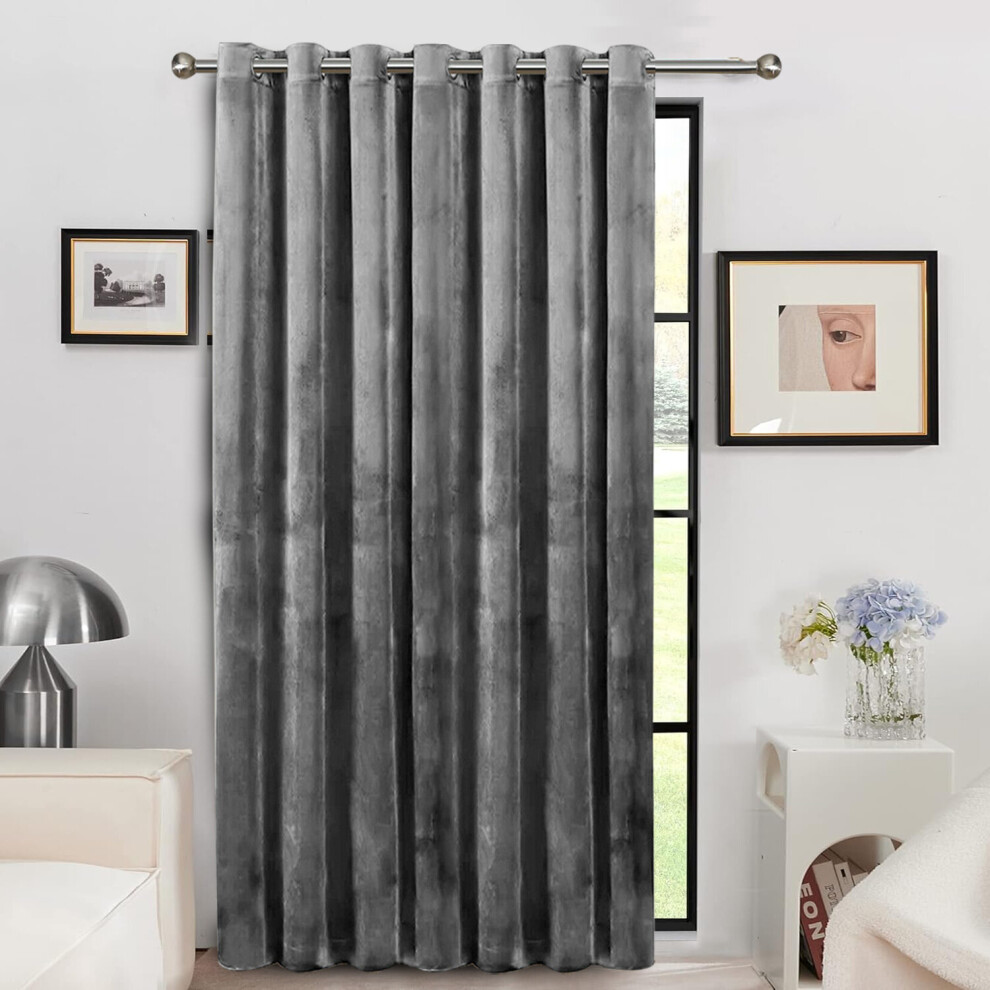(Grey) Blackout Velvet Door Curtains Ringtop Eyelet Single Panel Curtain with Tieback