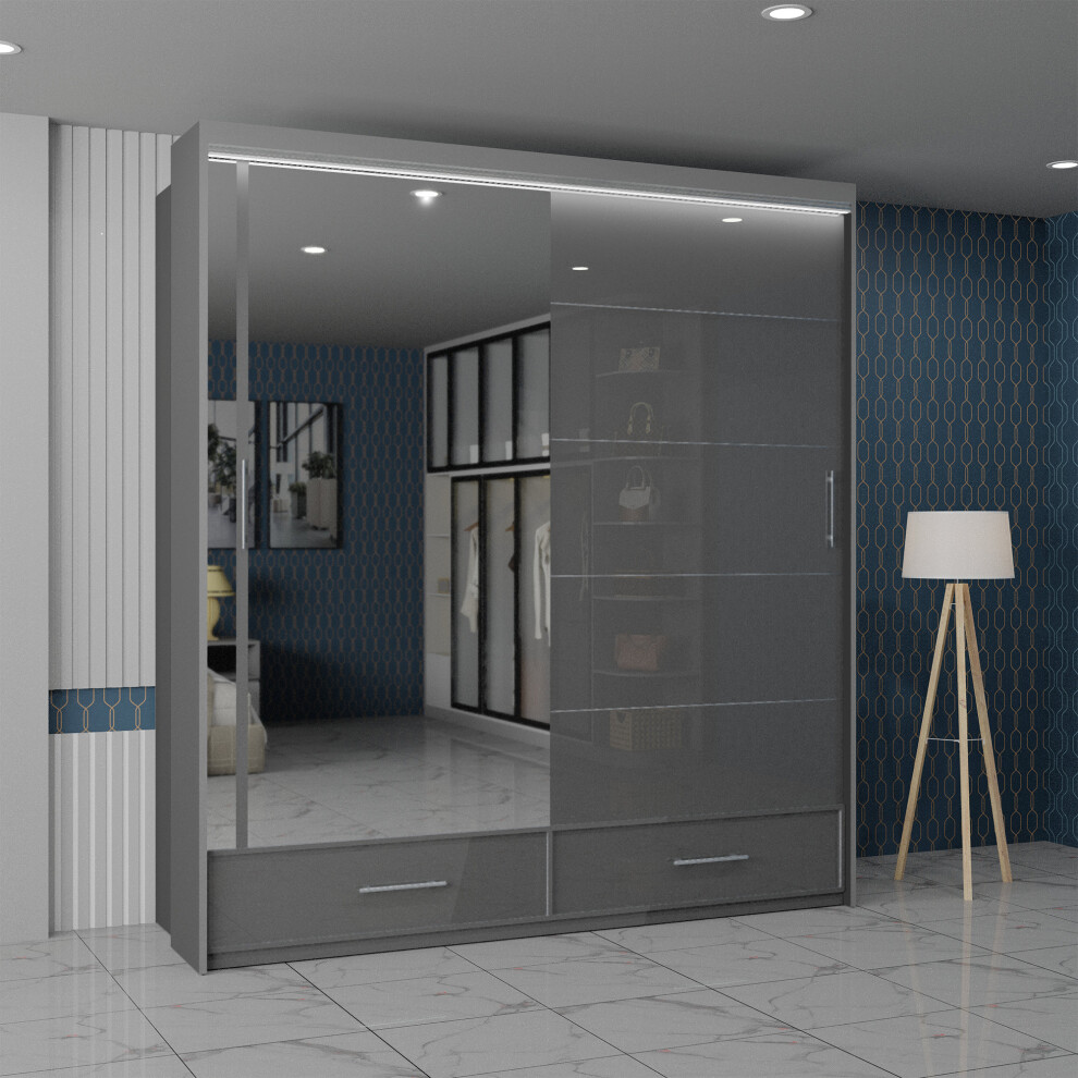 (Grey, 203cm) Sliding Wardrobes 4U LED Mirror Sliding Wardrobe