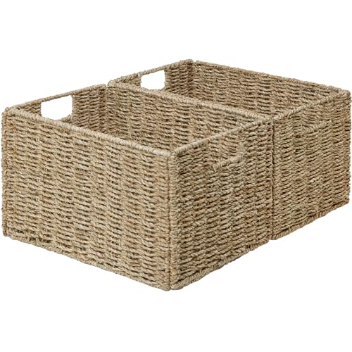 Vagusicc Wicker Storage Basket, Set of 2 Hand-Woven Storage Baskets for Organizing, Small Wicker Basket for Toilet Paper, Foldable Large Cube Storage Organizer Basket Bins for Shelves (Sea Grass)