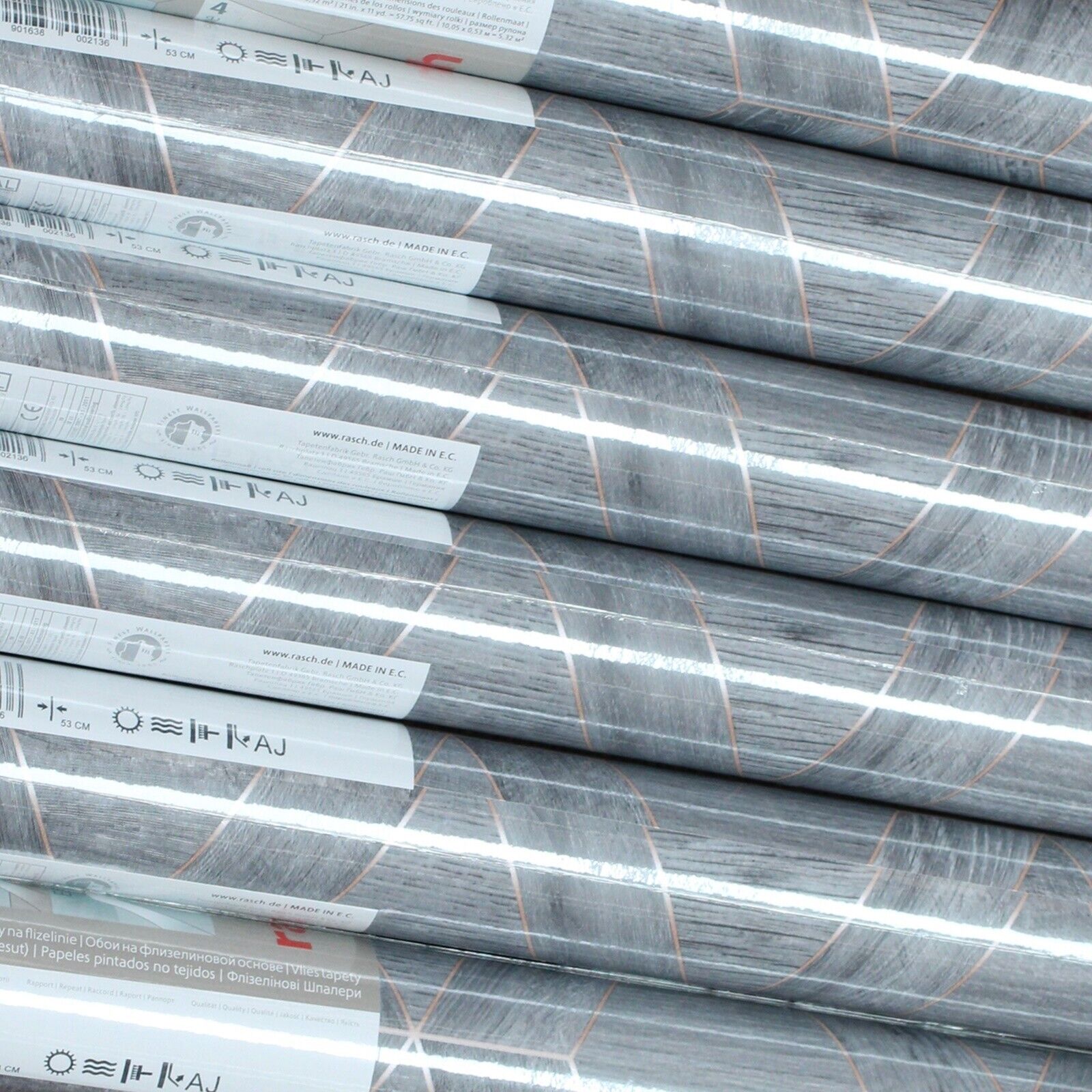 4 Rolls Grey Wallpaper Wood Effect Metallic Copper Geometric Diamond Feature
