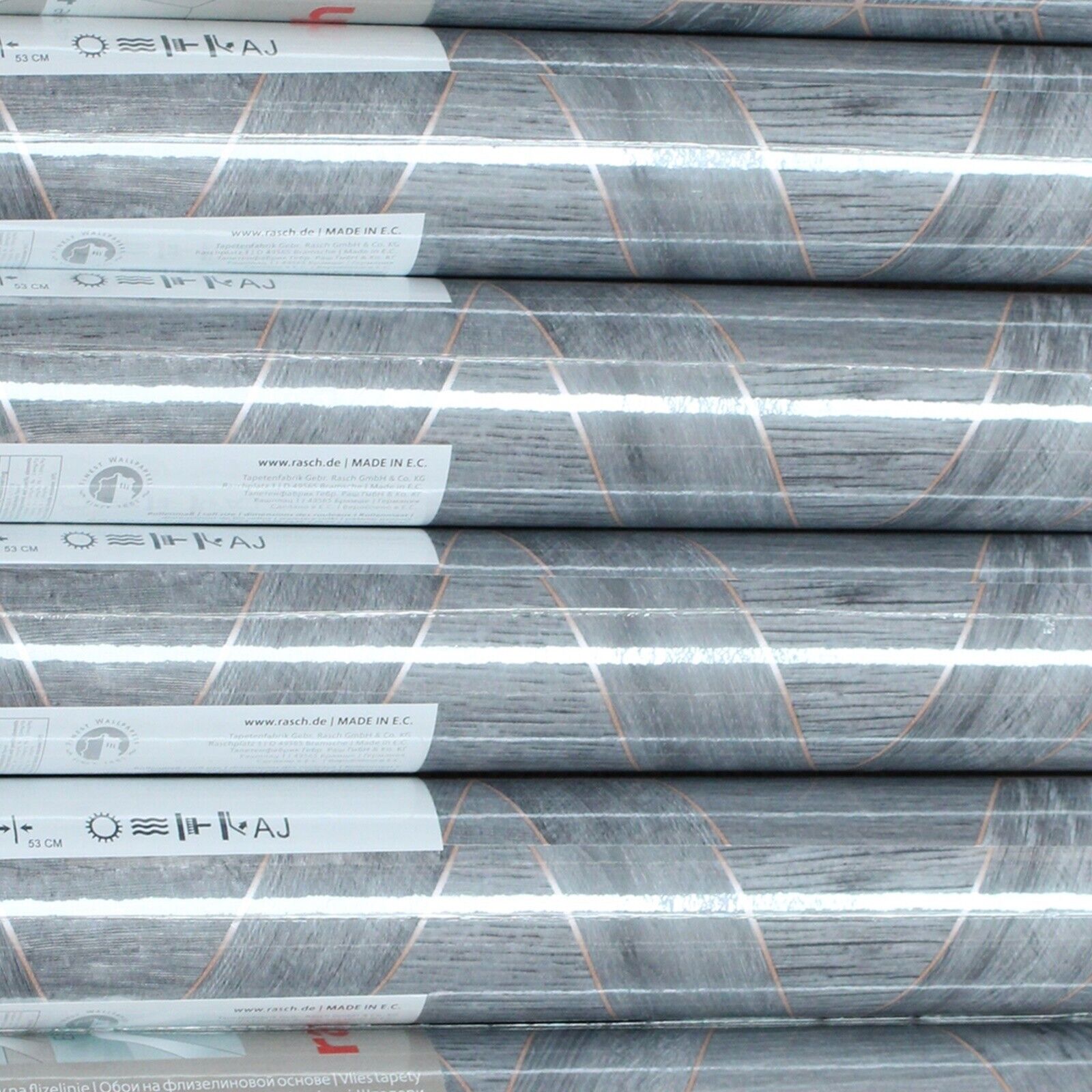 5 Rolls Grey Wallpaper Wood Effect Metallic Copper Geometric Diamond Feature