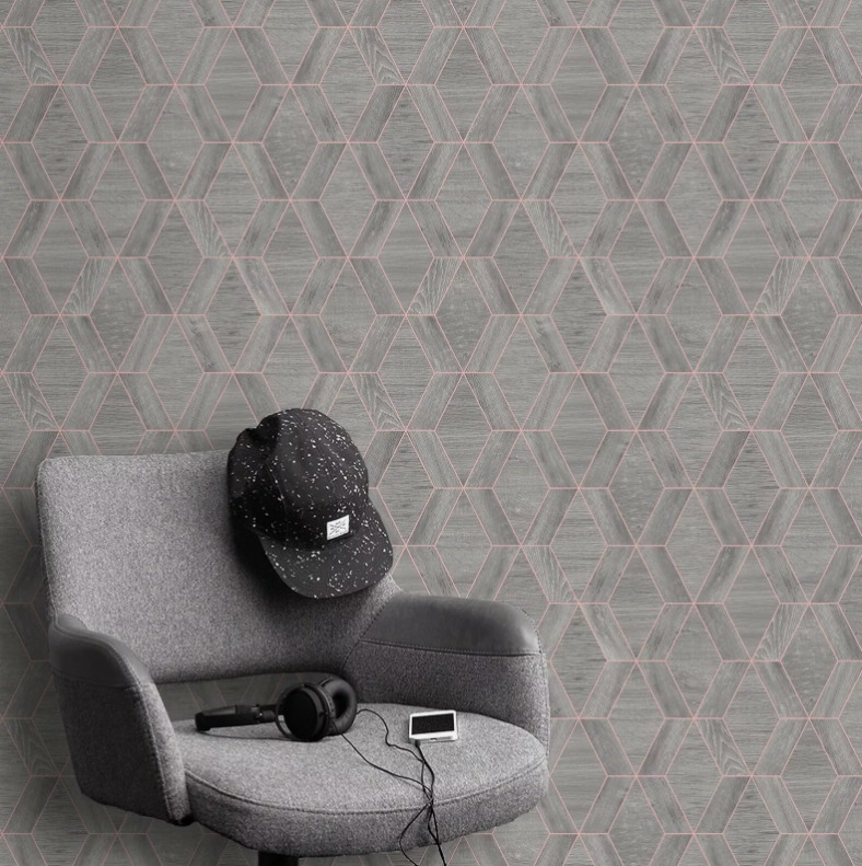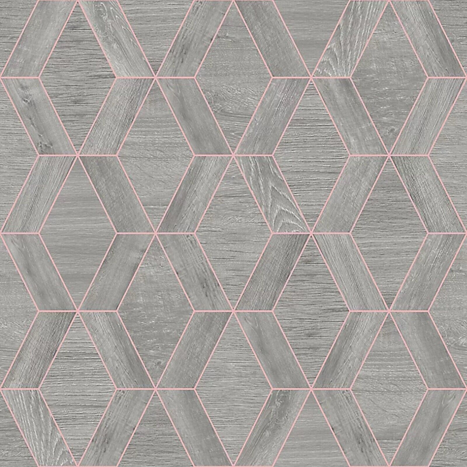 Geometric Diamond Grey Wallpaper Wood Effect Metallic Copper Feature Paste Wall