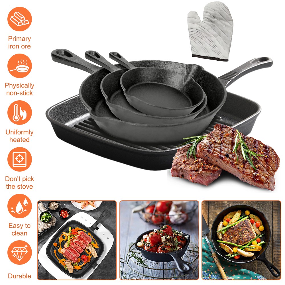 4Pcs Cast Iron Griddle Frying Pan Grill Non-Stick Skillet Cooking Square Steak