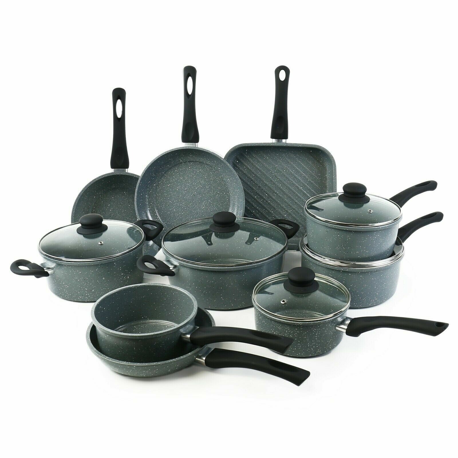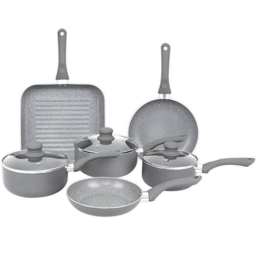 Gr8 Home 9 Piece Non Stick Pan Set with Glass Lids & Steam Vent | Induction Compatible Cookware Set with Handles | Grey Marble Effect Frying Pan, Saucepan & Grill Pan Kitchen Cookware Set