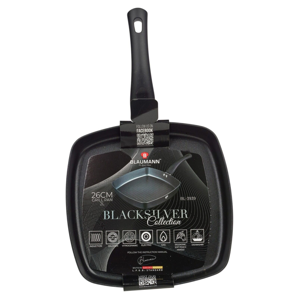 ( Matt Black, 26cm Ribbed Grill Pan - 2L) Blaumann Cookware Frying Grill Pots Pan Saucepan Casserole Soft Touch Handle Lid