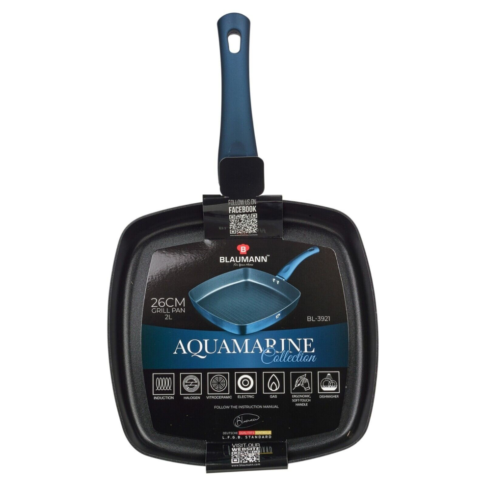 ( Aquamarine, 26cm Ribbed Grill Pan - 2L) Blaumann Cookware Frying Grill Pots Pan Saucepan Casserole Soft Touch Handle Lid