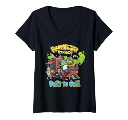 Womens Frankenburger Express Built to Grill Food Halloween V-Neck T-Shirt