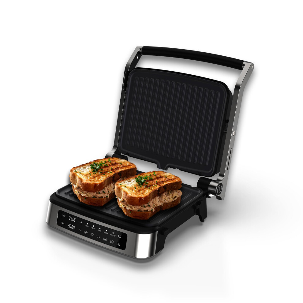 Electric Indoor Contact Grill with Dual Zone Control, Removable Plates, 180 Open Design, 5 Presets