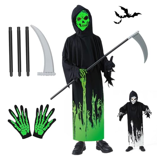 Antsparty Grim Reaper Costume Kids Boys Halloween Costume, Glow In The Dark Grim Reaper Set with Scythe Skull Mask Gloves, Kids Scary Halloween Fancy Dress