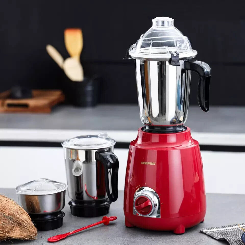 GEEPAS 600W 3-in-1 Mixer Grinder | Stainless Steel Jars, Blades | 3 Speed Control, Perfect for Chutney, Dry & Wet Fine Grinding Mixing | Overload Protection | Shockproof Body | 2 Year Warranty, Red