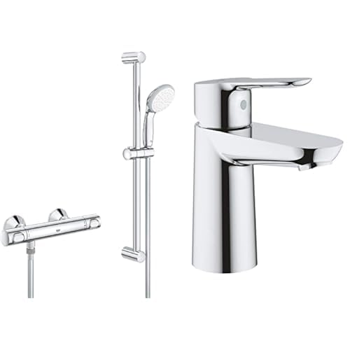 GROHE Precision Flow - Wall Mounted Thermostatic Mixer Shower Set, Chrome, 34841000 & BauEdge - Smooth Body Single-Lever Basin Mixer Tap, Size 144mm, Chrome, 23330000