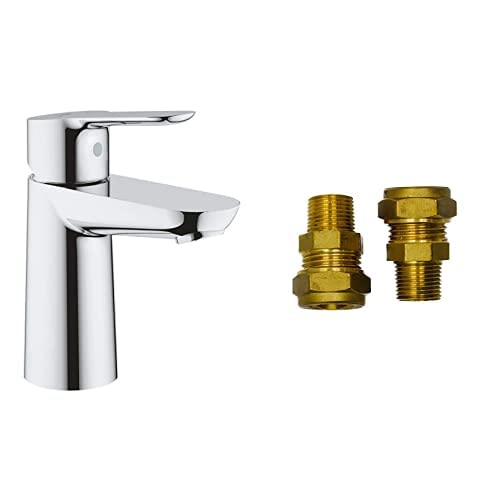GROHE BauEdge & UK Adaptors - Smooth Body Basin Mixer Tap (1 Hole Inst., 1 Metal Lever, 28 mm Ceramic Cartridge, Water Saving Technology, No Waste Set, Tails 3/8 inch), Size 144 mm, Chrome, 23330000