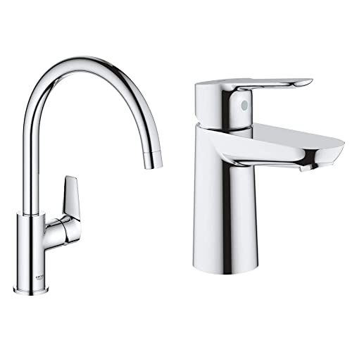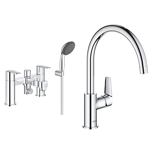 GROHE 25177000 | Get Deck Mounted Mixer Shower Set & BauEdge Kitchen Tap, Tool Less Fitting, Chrome Mixer Tap 31367001