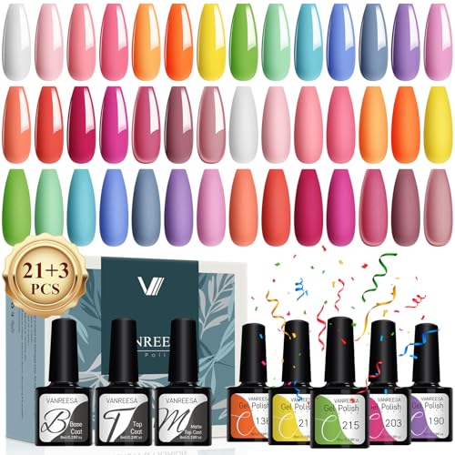 VANREESA 24 PCS Gel Nail Polish Set Spring Summer Colours Pink Blue Green Gel Polish Set Soak Off U V Nail Polish Kit with Base and Top Coat Nail Varnish DIY at Home Gifts for Women