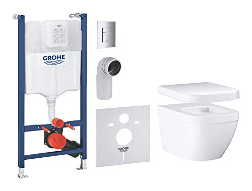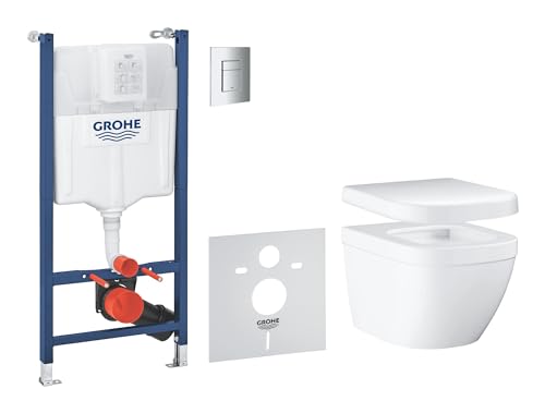 GROHE Solido Euro Ceramic 5-in-1 Box Solution (White Wall Hung Toilet with Soft Close Seat, Chrome Flush Plate, WC Frame 1.13 m, Sound Insulation, 2 Wall Brackets), Ready to Install, 39890000