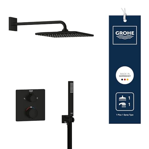 GROHE Vitalio Comfort 250 Bath Thermostatic Shower System with Aquadimmer (Cube 25cm Head Shower Rain Spray and 11cm Hand Shower 2 Sprays: Rain & Jet, Hose 1.75m, Water Saving), Matt Black, 269842431