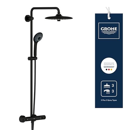 GROHE Vitalio Joy 260 - Shower System with Thermostat and Tray (Water Saving, 3-Spray Head Shower 26cm with Ball Joint Rotation Angle, 3-Spray Hand Shower 11cm, Hose 1.75 m), Matt Black, 264032432