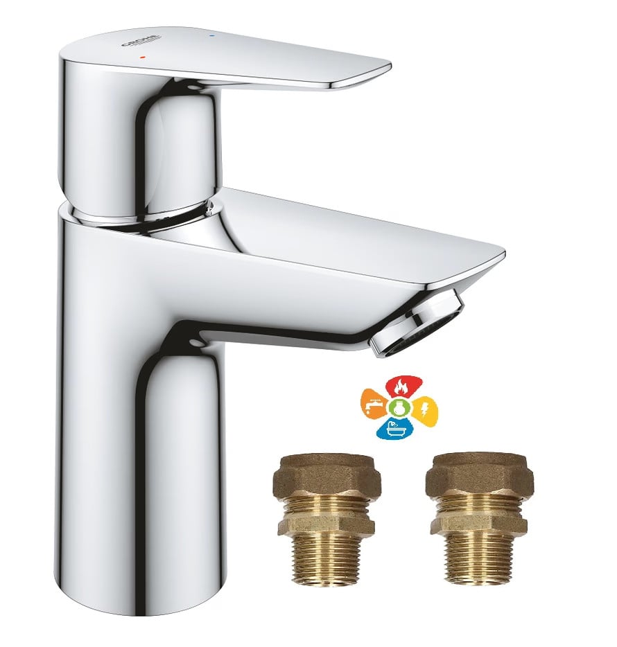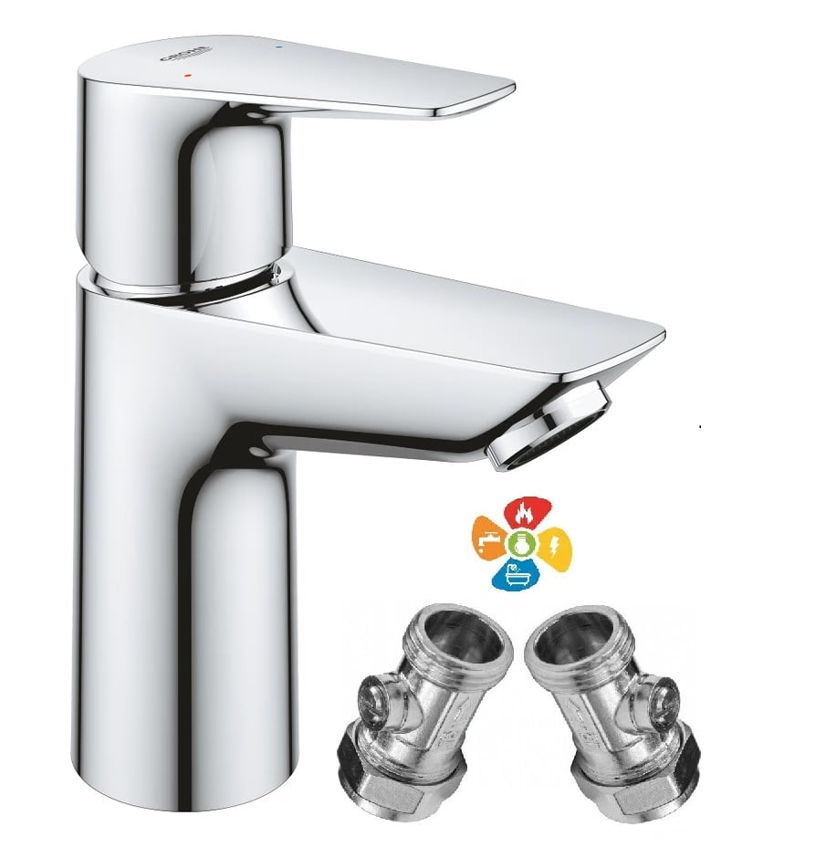 Grohe BauEdge Single Lever Mono Basin Mixer Tap Smooth Body + UK 3/8" Iso Valve