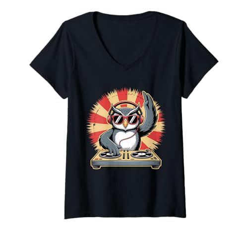 Womens Owl DJ Mixing Beats Fun Headphones Groove Retro V-Neck T-Shirt