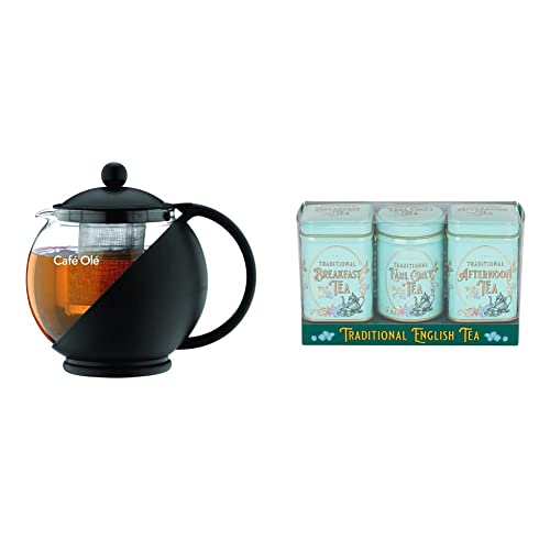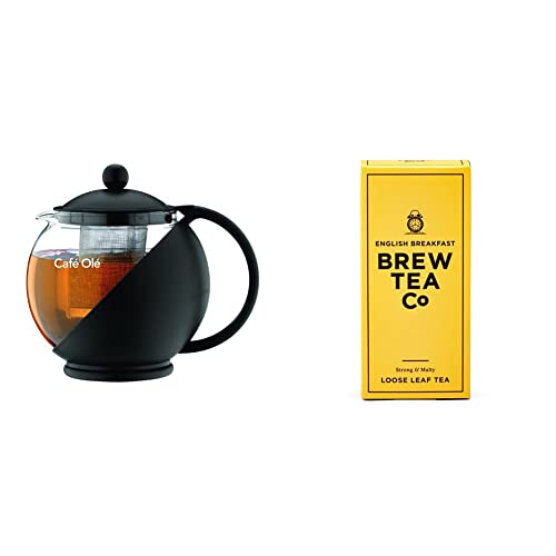 Café Olé Grunwerg Café Ole Loose Leaf Everyday Round Tea Pot Infuser Basket Glass Teapot, Black, 1.20 Litre, 1200ml / 1.2 & Brew Tea Co - English Breakfast - Strong and Malty - 113g Loose Leaf Tea