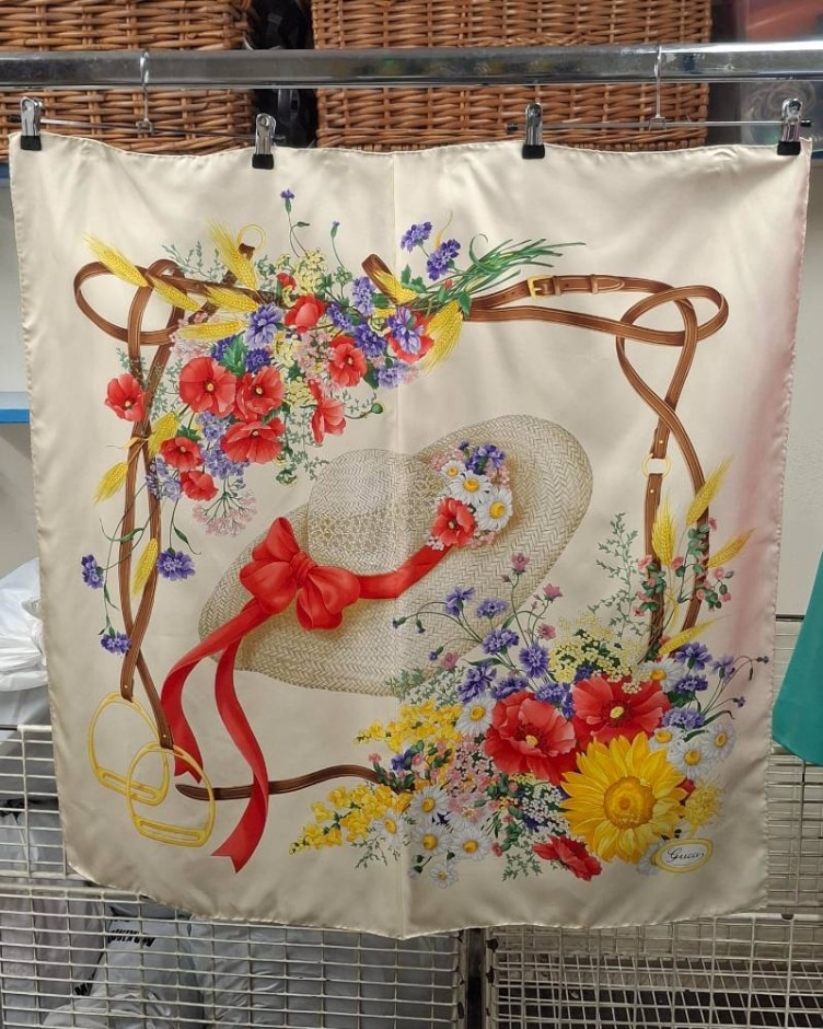 Vintage Gucci Silk Scarf Bonnet, Stirrups And Floral Design