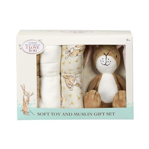 Rainbow Designs Guess How Much I Love You Baby Essential Gift Set - Little Nutbrown Hare Soft Toy & 3 Cotton Muslin Cloths in Illustrated Box - Newborn Baby Shower Present