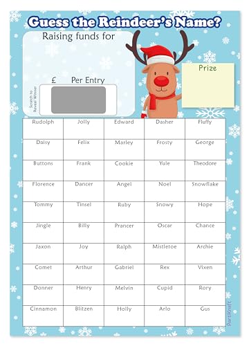 PartiKraft - 4 x A4 Christmas Fundraising - Guess The Reindeer's Name - Scratch To Reveal Game Card - 50 Boxes