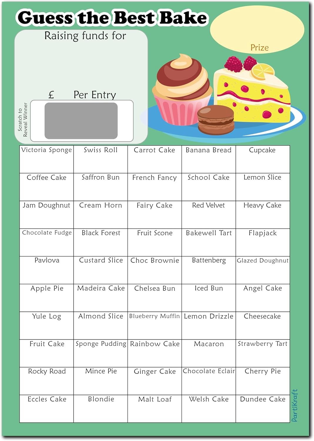 PartiKraft - 2 x A4 Fundraising - Guess The Best Bake - Scratch To Reveal Game Card for Coffee Mornings - 50 Boxes