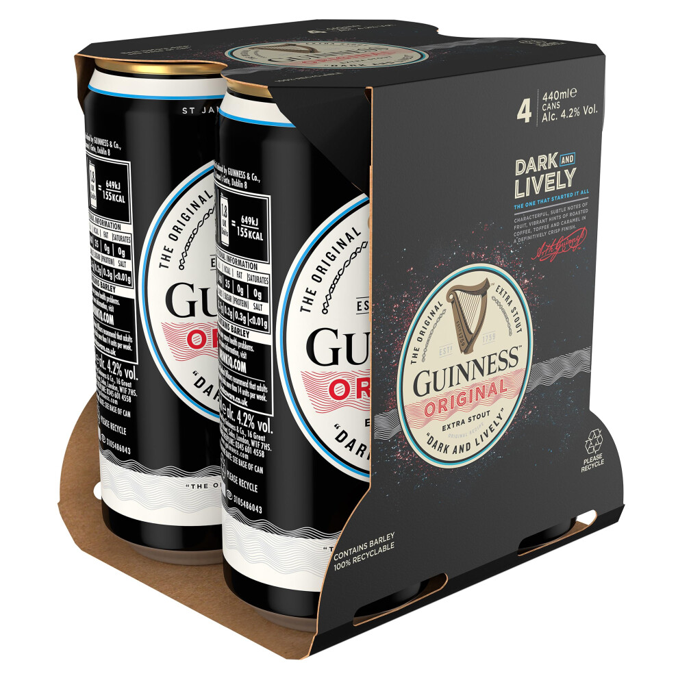 Guinness Original Extra Stout | 4.2% vol | 4 x 440ml Beer Cans| Medium & Balanced | Bitter & Sweet | Rich Creamy Head | Crafted from Quality Malt |
