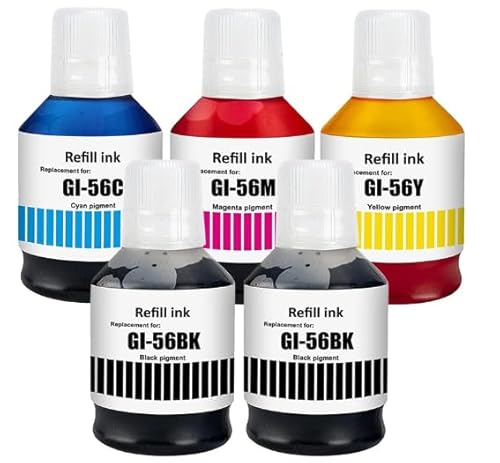 Black Bottled Ink GI56 GI-56/ Cyan Bottled Ink GI56 GI-56/ Magenta Bottled Ink GI56 GI-56/ Yellow Bottled Ink GI56 GI-56 Work for Canon MAXIFY GX7050/GX6050/GX5050/GX4050/GX3050 (5 Packs, 2BK-C/M/Y)