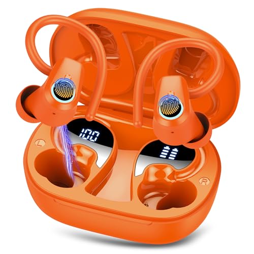Wireless Earbuds, Bluetooth 5.3 Headphones with 4 ENC Noise Canceling Mic, 50H Stereo Dual LED Display Ear Buds, Sport Wireless Earphones with Earhooks, IP7 Waterproof Wireless Headphones Gym, Orange