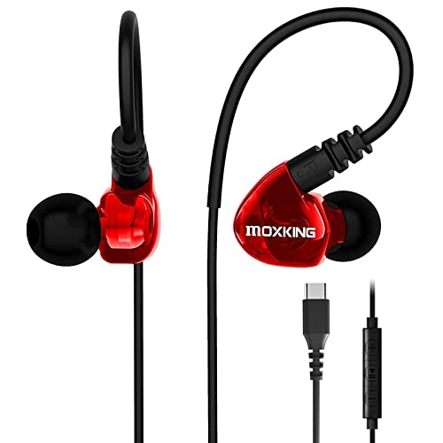 MOXKING USB C Running Sports Earbud, Type C Headphones Wired Over Ear In Ear Headsets Enhanced Bass Stereo Earphones with Microphone and Remote for Running Jogging Gym (RED-TypeC)