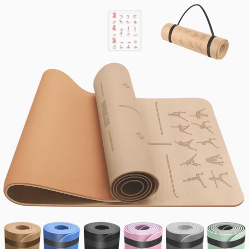Yoga Mat with Alignment Lines,TPE 6mm Sports Exercise Mat,Non-Slip,for Gymnastics,Pilates,Home, Travel,Gymnastics Mat with Storage Straps,Yoga Mats for Women and Men,183x61x1cm