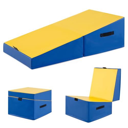 COSTWAY Large Foldable Incline Gymnastics Mat, Kids Cheese Wedge Skill Shape Fitness Tumbling Gym Yoga Mats, for Boys and Girls Home Training Aerobic Exercise (Yellow+Blue)