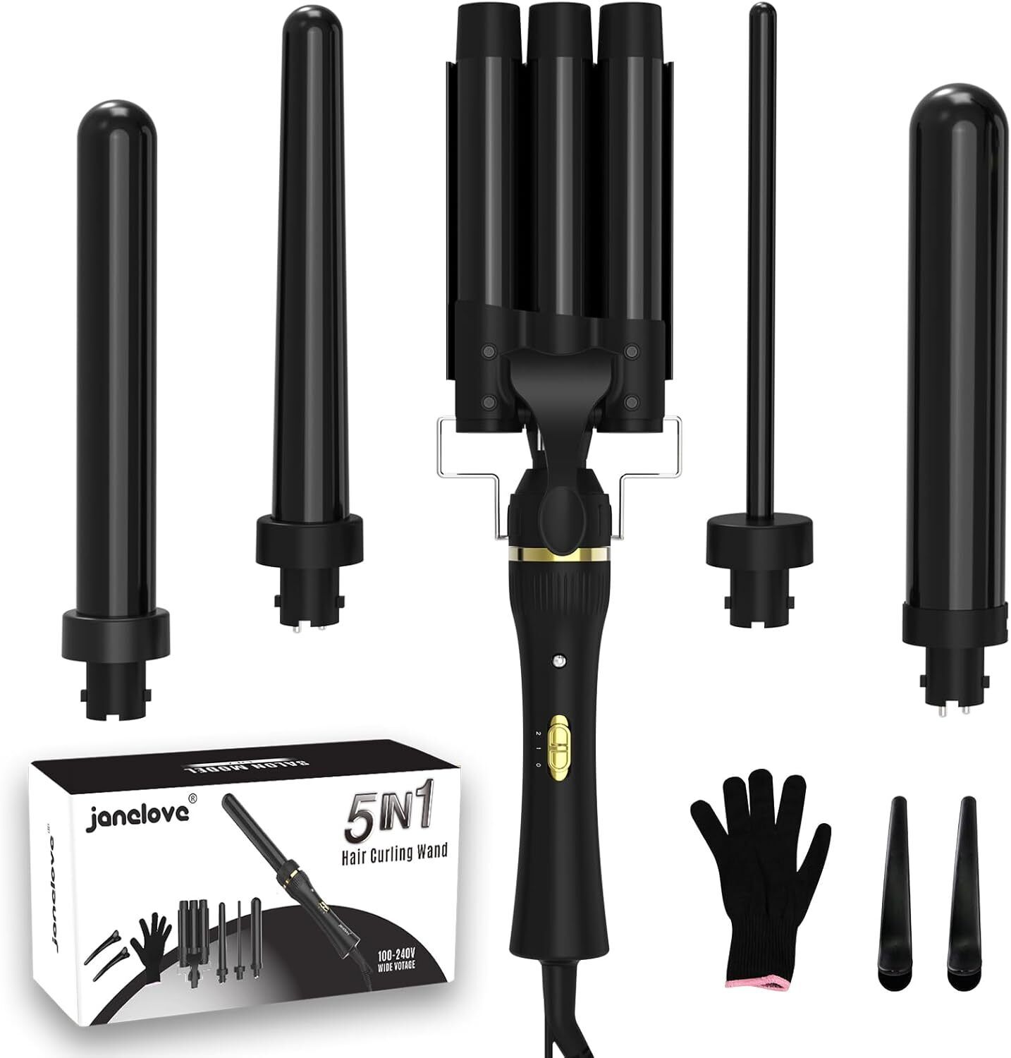 janelove Hair Curler 5 in 1 Curling Wand Set with 3 Barrel Hair Waver and 4 Int