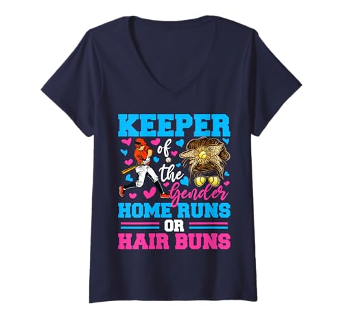 Womens Keeper of The Gender Home Runs Or Hair Buns Reveal Party V-Neck T-Shirt