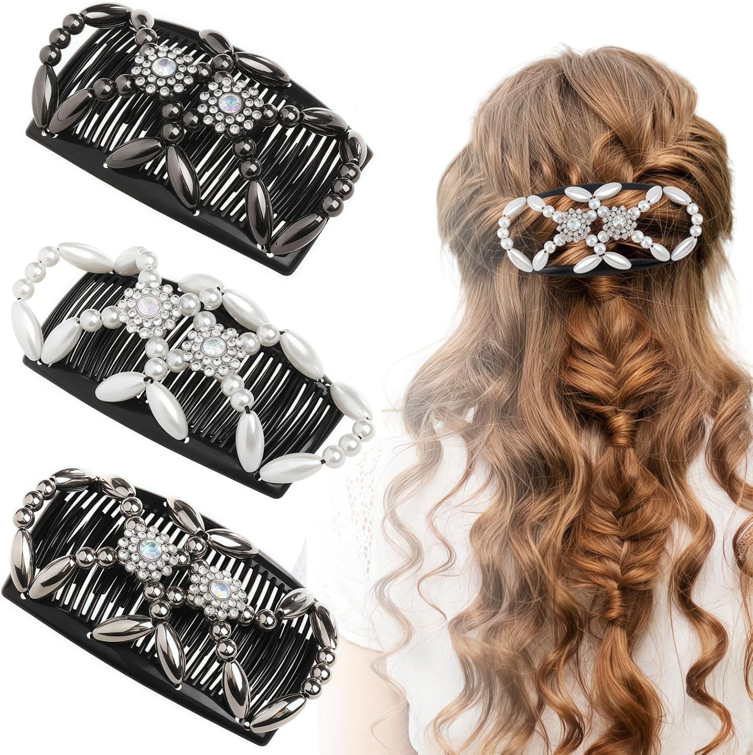 DIY Hair Styling Accessories, Magic Hair Combs Stretch Beaded Hair Combs Elastic Double Comb Clips for Women Girls, Elegant Stylish Comb Slides Secure