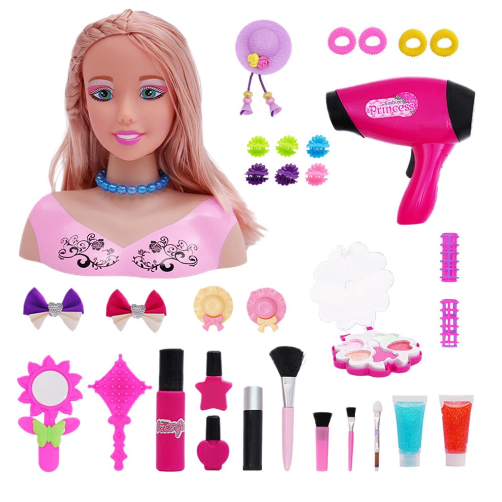 Hairdressing head, makeup for girls, toys for children, practical, simulation game, beauty set with hair dryer, crown brushes, comb accessories