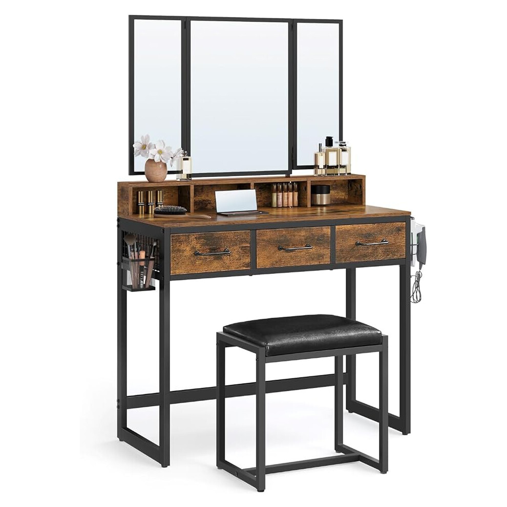 Dressing Table with Mirror and Stool, Vanity Table with Tri-Fold Mirror, 3 Drawers, Hair Dryer Holder