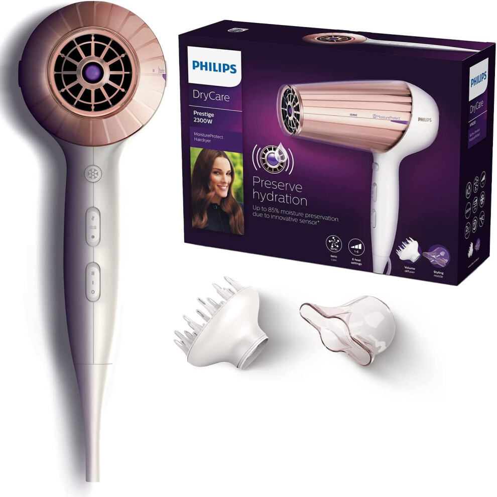 Philips DryCare Prestige HP8280/00 - Professional Hair Dryer, DC Motor, Ionic, Nozzle and DiffUser, 3 Speeds, 3 Temperatures, 2300w, White and Pink