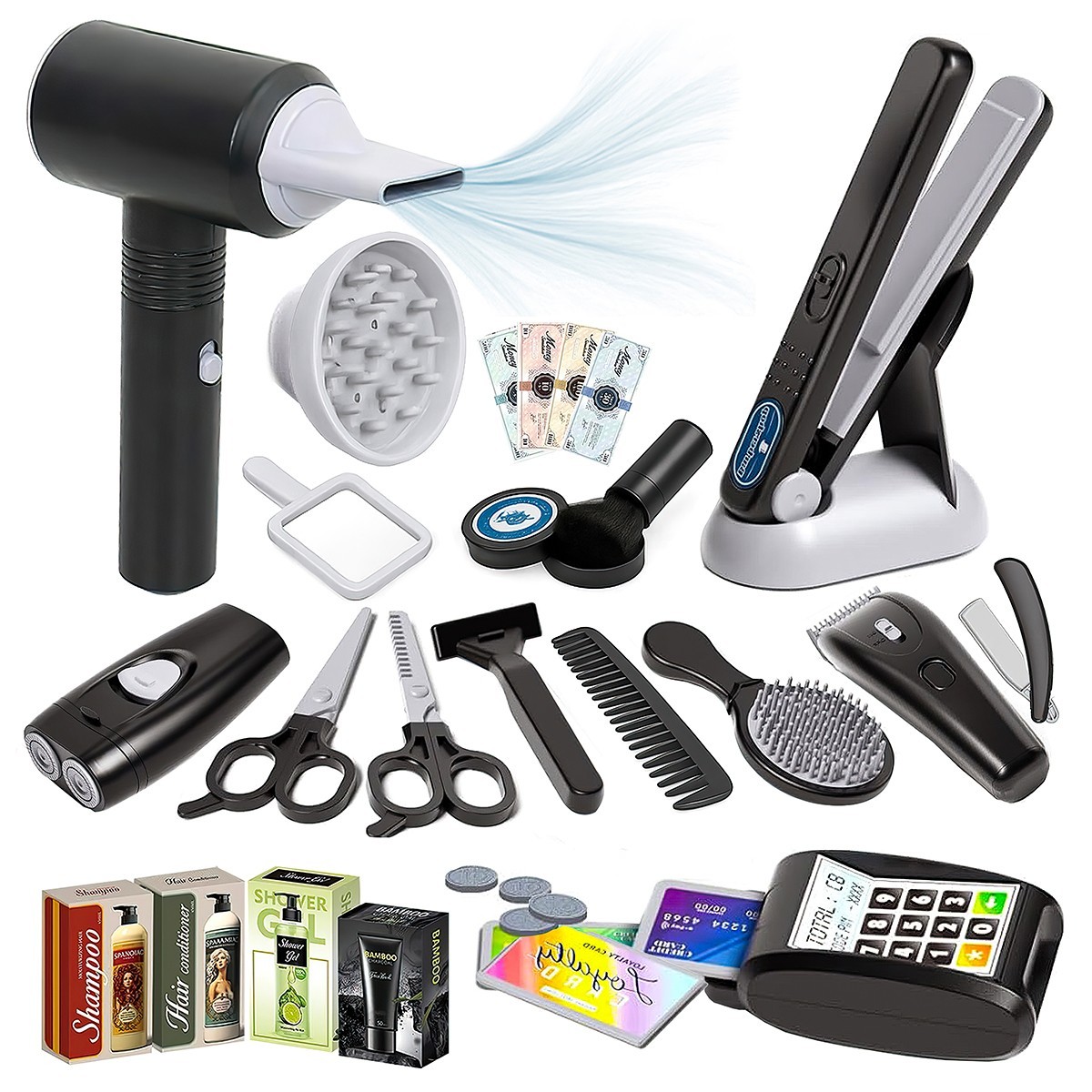 Boys Girls Pretend Play Barber Set Stylist Hairdresser Role Play Hair Dryer Scissors Beauty Play Set and Accessories