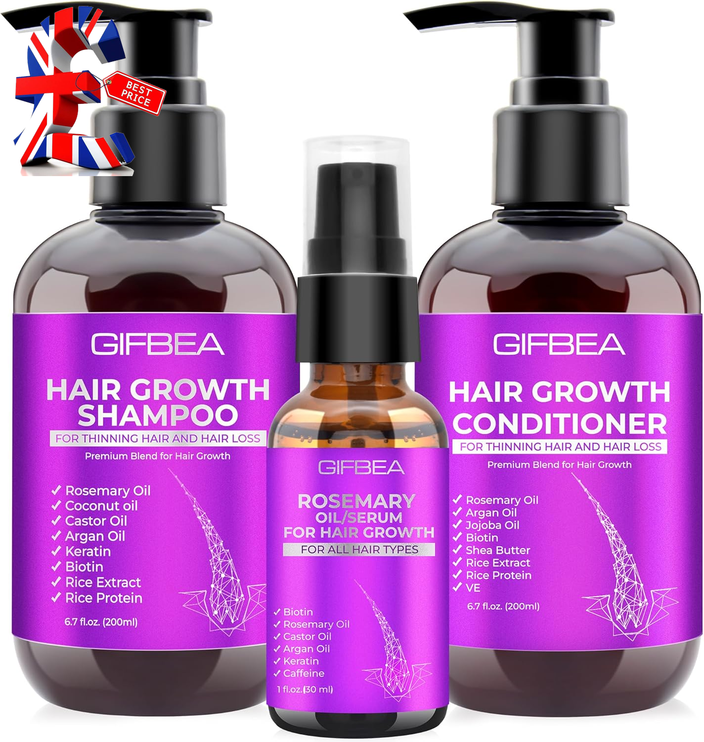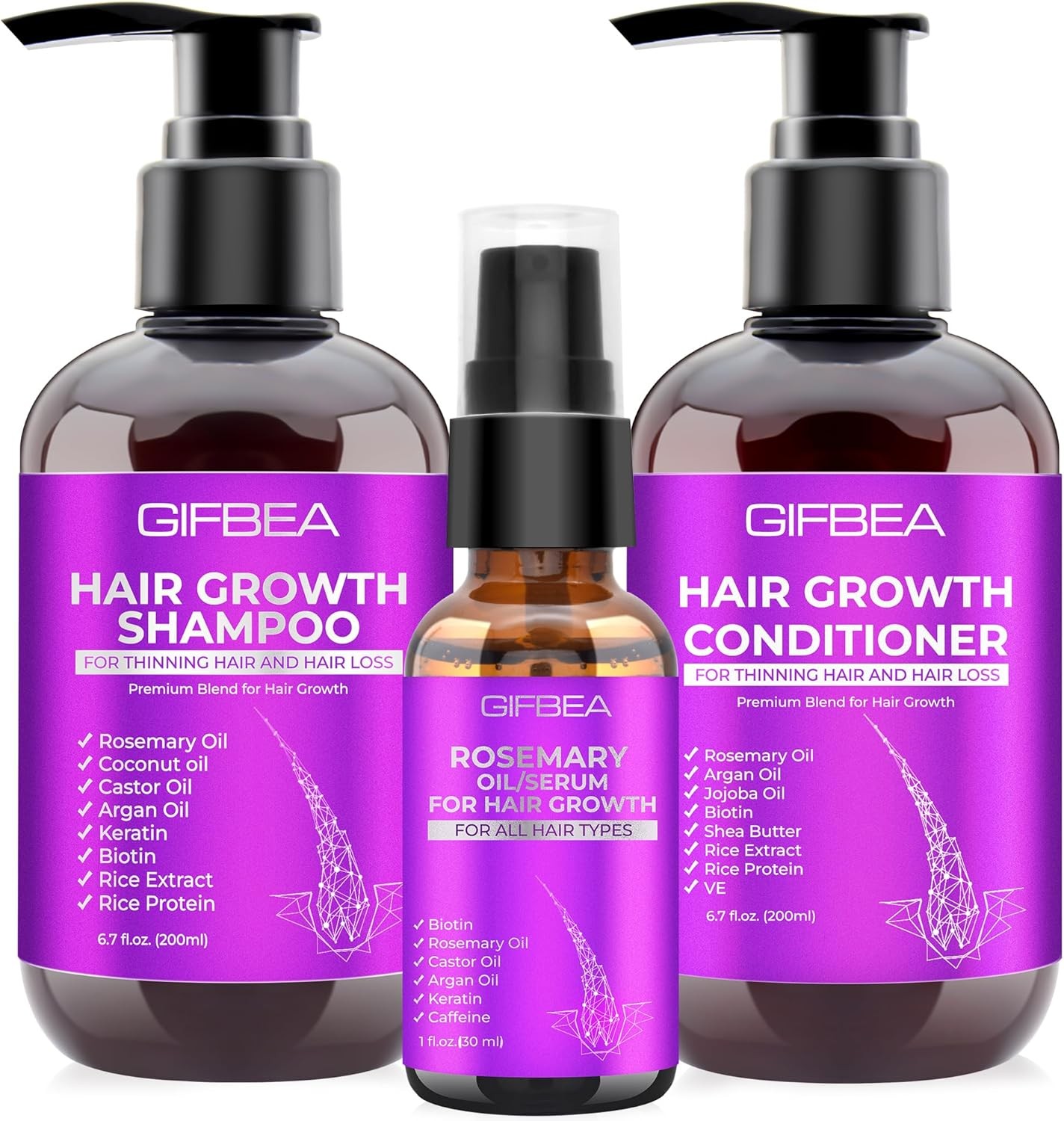 GIFBEA Hair Growth Shampoo and Conditioner Set with Rosemary Oil Serum, Biotin, Argan, Castor, Coconut, Keratin, Rice Water - Hair Loss Treatment, Thickening for Women and Men