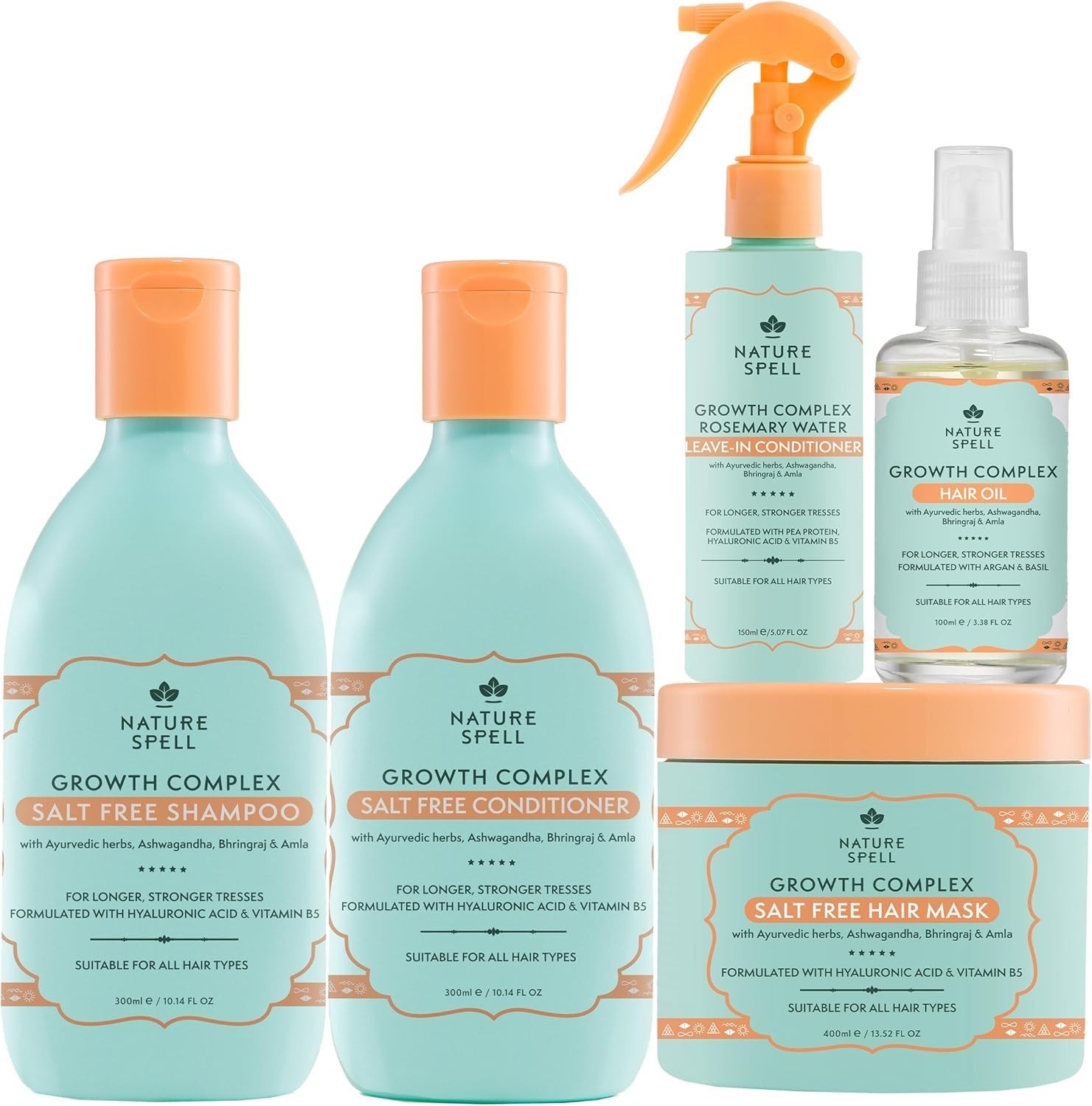 Nature Spell Growth Complex Hair Growth Set, Includes Shampoo, Conditioner, Mask, Leave-In & Oil with Hyaluronic Acid and Vitamin B5, For All Hair Types, Colour Safe, Vegan, Pack of 5