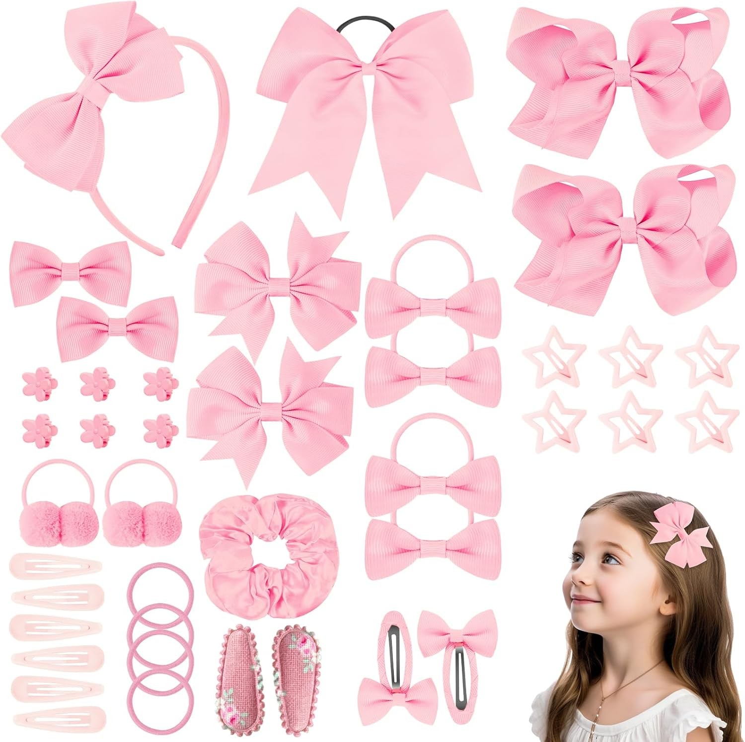 LOPHE 77Pcs Pink Girls School Hair Accessories Kit, Hair Bows Elastic Headbands