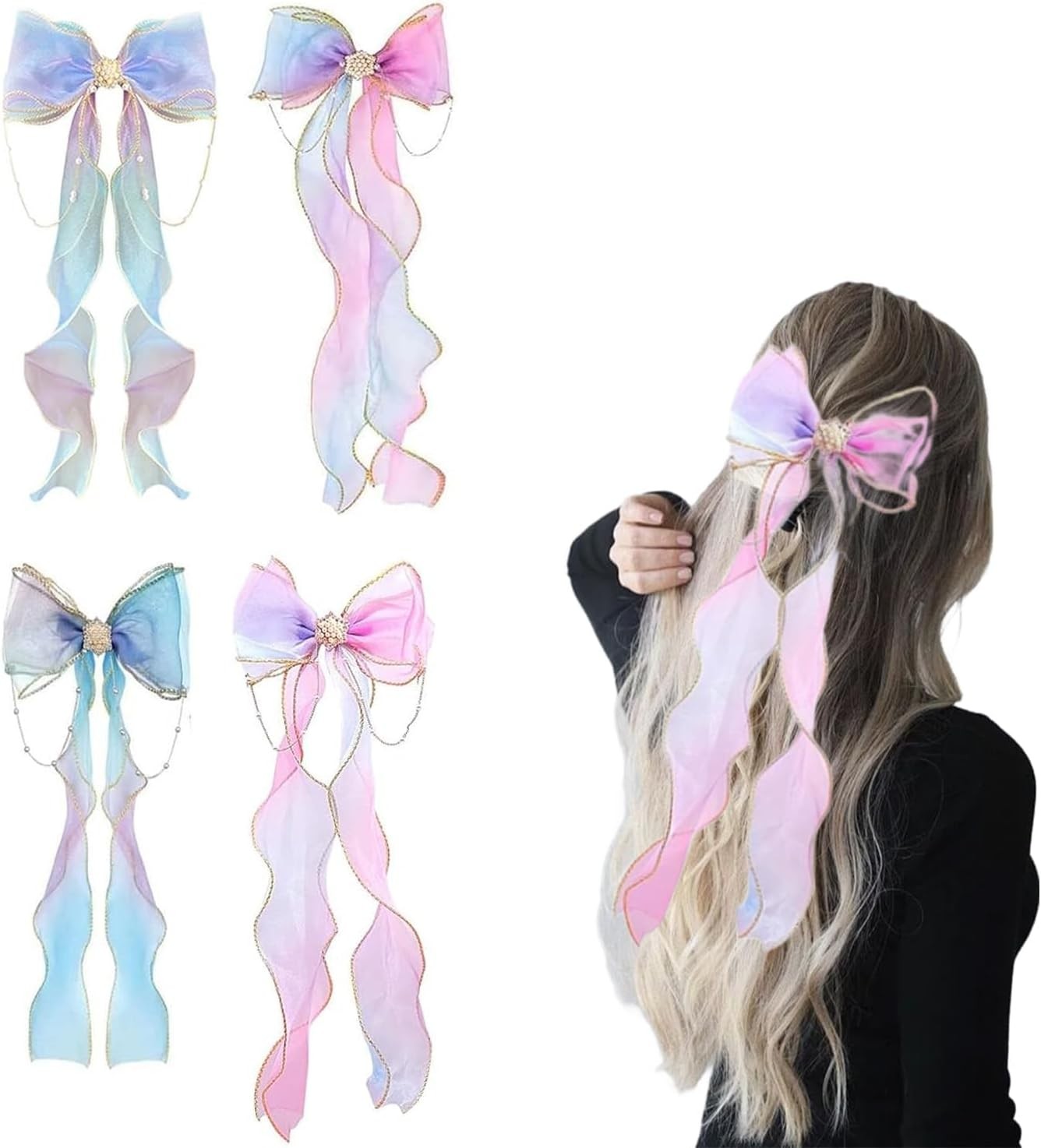4 Pcs Colorful Ribbon Hair Bows,Girls Hair Bows,Colorful Butterfly Long Ribbon